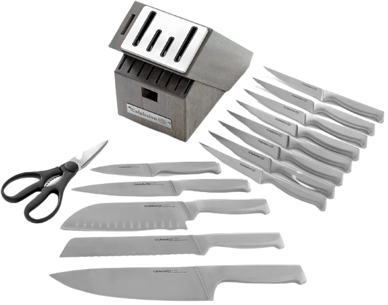 The Calphalon Kitchen Knife Set provides great value for your money. It comes with 13 quality knives, designed to make it easier and more comfortable to use in the kitchen. The included self-sharpening block keeps the blades sharp, so you don't have to worry about dulling the edges of your knives.