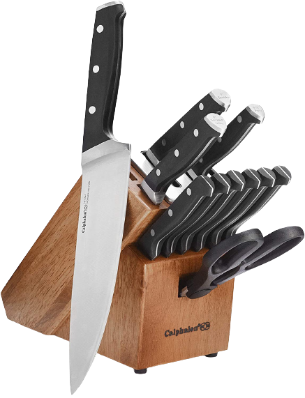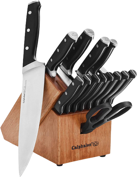 The best Caphalon knife set for most home cooks is the Caphalon Classic Self-Sharpening Cutlery Block Set. This 15-piece set includes a sharpening block and all the essential knives you'll need to make meal prep easier, asian steel, from paring knives to an 8" chef's' knife. The self-sharpening slots keep your blades sharp each time you use them.